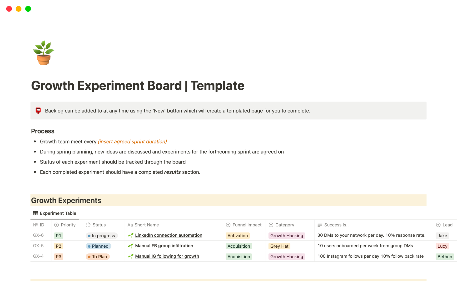 There are a number of other growth marketing related Notion templates at https://www.notion.so/templates/category/growth-marketing.