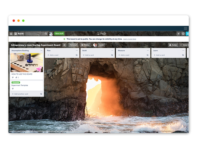 The Intrapreneur Nation Hypothesis Testing Board is a lean, Kanban-style Trello board that you can use to track progress of your lean startup experiments.